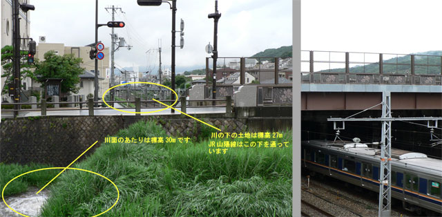 このあたりは先ほどの武庫川の堤防のあたりよりさらに川床と土地の高低差が大きくなっていて、川床のあたりは標高30m、電車が通っているあたりは標高27mと、3mも土地の方が低くなっています。